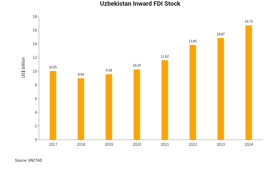 In terms of foreign investment, there has been a constant inflow and steady uptrend of inward FDI stock. Since the economic reforms in 2017, Uzbekistan has recorded constant foreign investment inflow. Despite a slight decline in inward FDI stock in 2018, which may be due to the depreciation of UZS after the currency became free‑floating in late 2017, the inward FDI stock has increased from about US$9 billion in 2018 to over US$16.7 billion in 2024, with a compound annual growth rate of 11%.