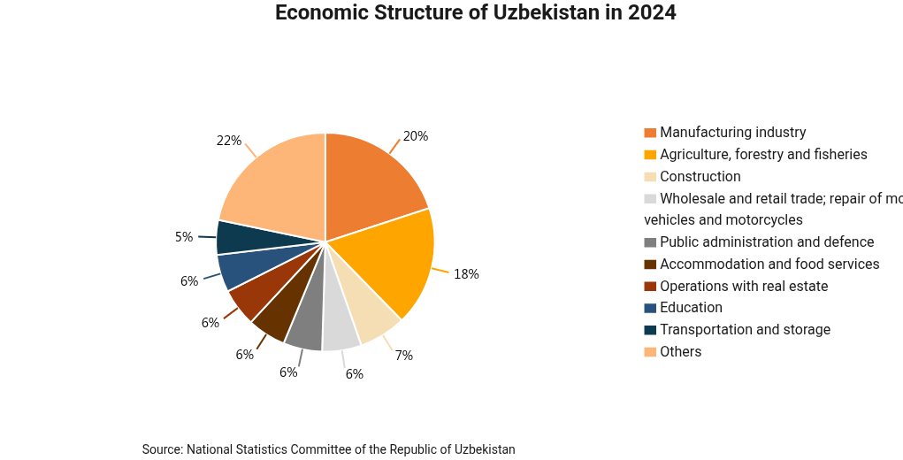 Before the economic reforms, the agriculture, forestry and fisheries sectors had long been the largest industries in the Uzbek economy. In 2024, manufacturing has expanded to become the largest sector in the country, highlighting progress in diversification and industrial upgrade.