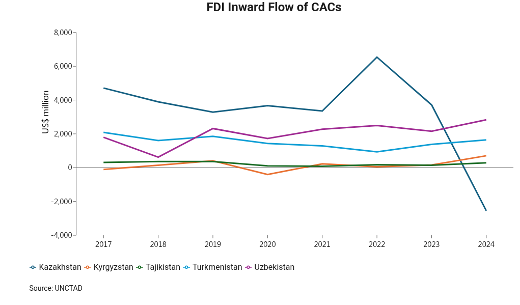 In terms of FDI flow, the inward flow has been hovering steadily at around US$2 billion each year since 2019. In 2024, Uzbekistan also became the Central Asian country with largest inward FDI flow.